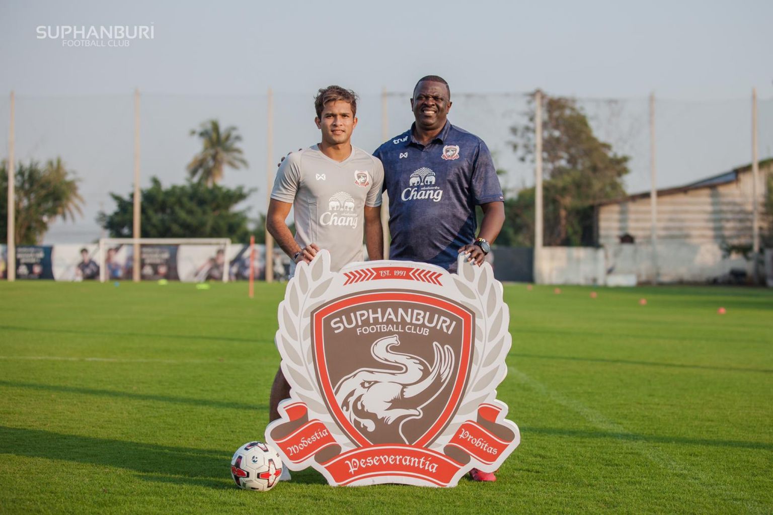 Singapore midfielder Zulfahmi Arifin (left) with Suphanburi FC coach Adebayo Gbadebo.
