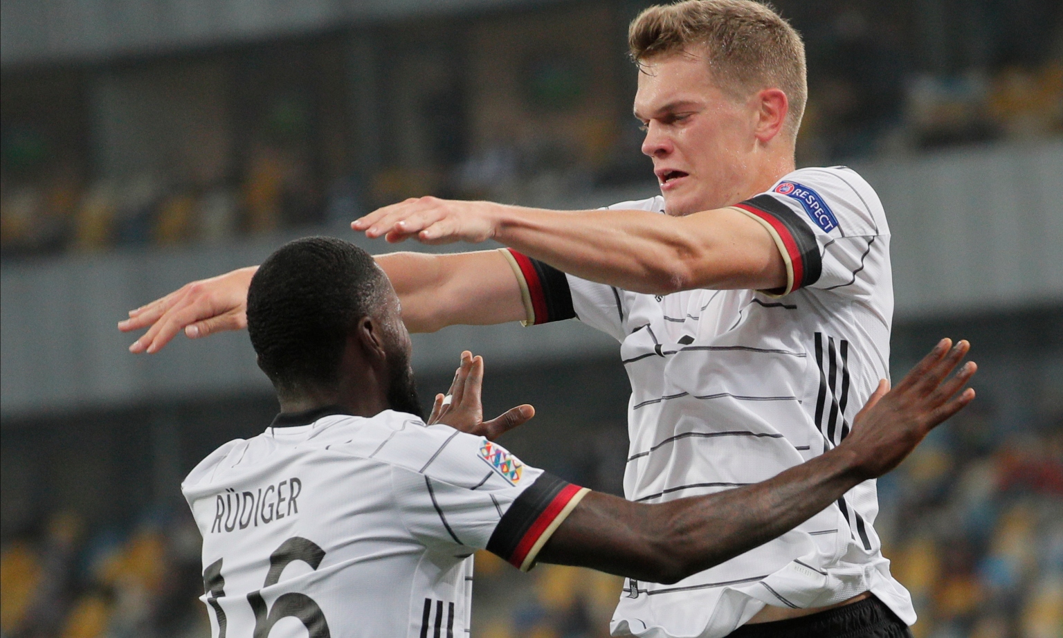 Matthias Ginter celebrating with Antonio Rudiger after opening accounts for Germany in the Uefa Nations League game against Ukraine in Kiev on Saturday. While not at their best, they won 2-1 for a first victory after three draws.