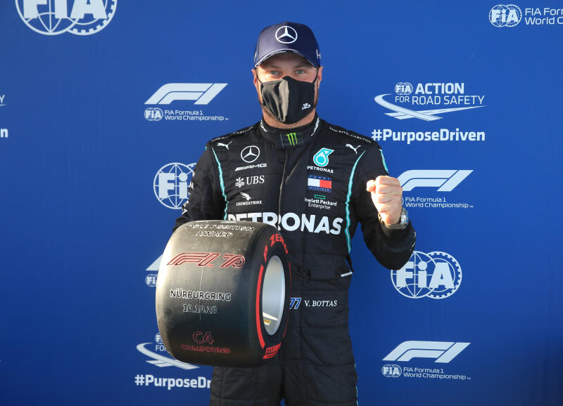 NURBURGRING, GERMANY (AFP) - Valtteri Bottas produced a blistering track record on his final qualifying lap on Saturday (Oct 10) to edge Mercedes teammate Lewis Hamilton and claim pole position for the Eifel Grand Prix.