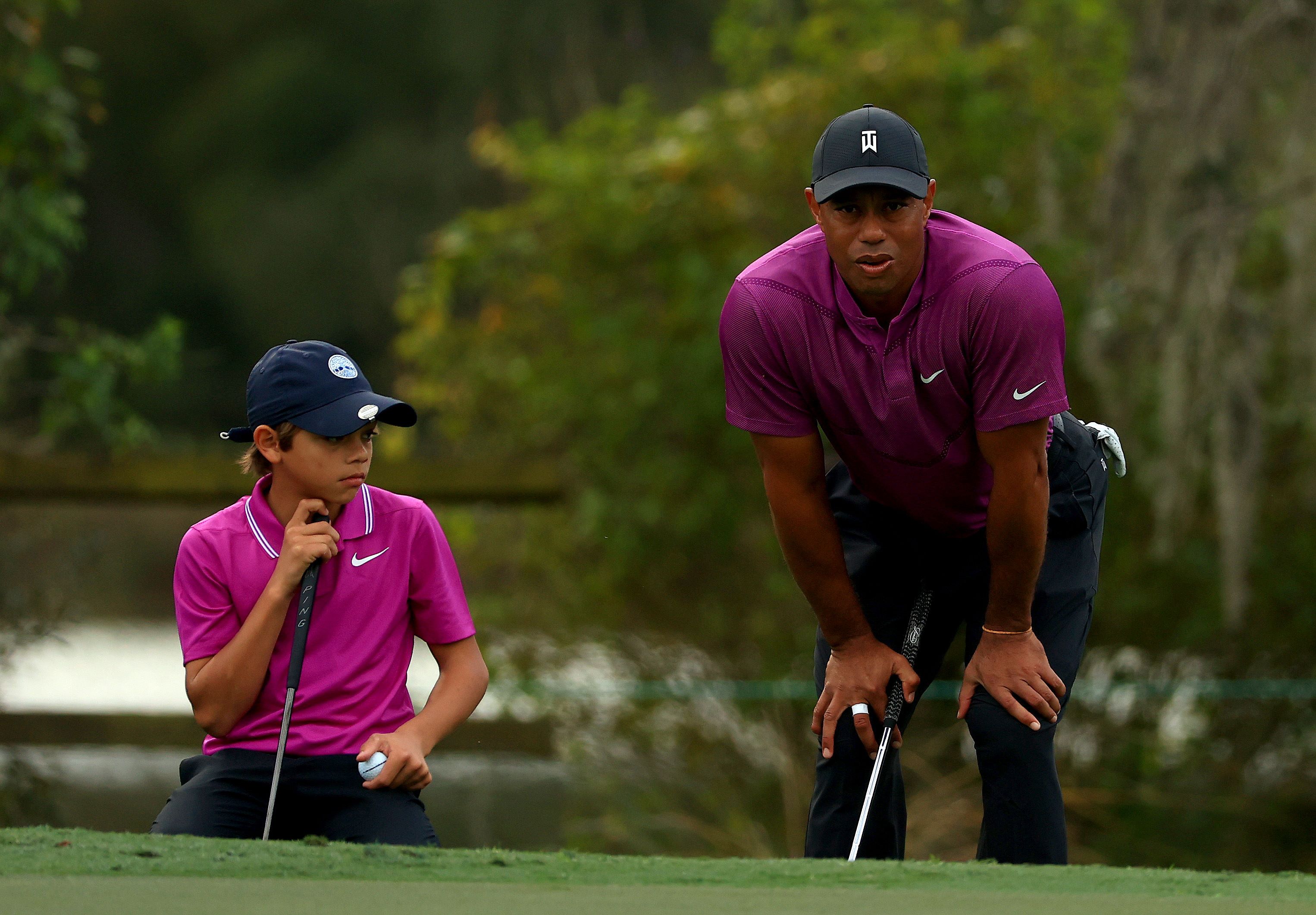 Father-son duo Tiger and Charlie Woods line up a putt during the PNC Championship at the Ritz Carlton Golf Club on Dec 19, 2020.