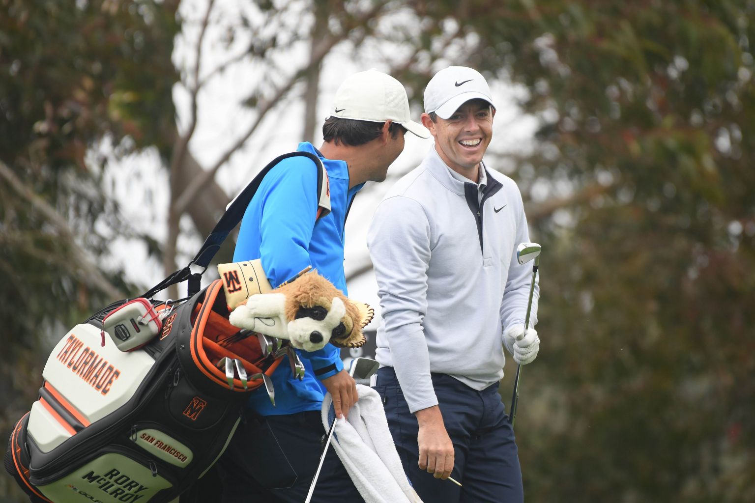 McIlroy laughs with his caddie, Harry Diamond, on the 11th hole during a practice round prior to the 2020 PGA Championship.