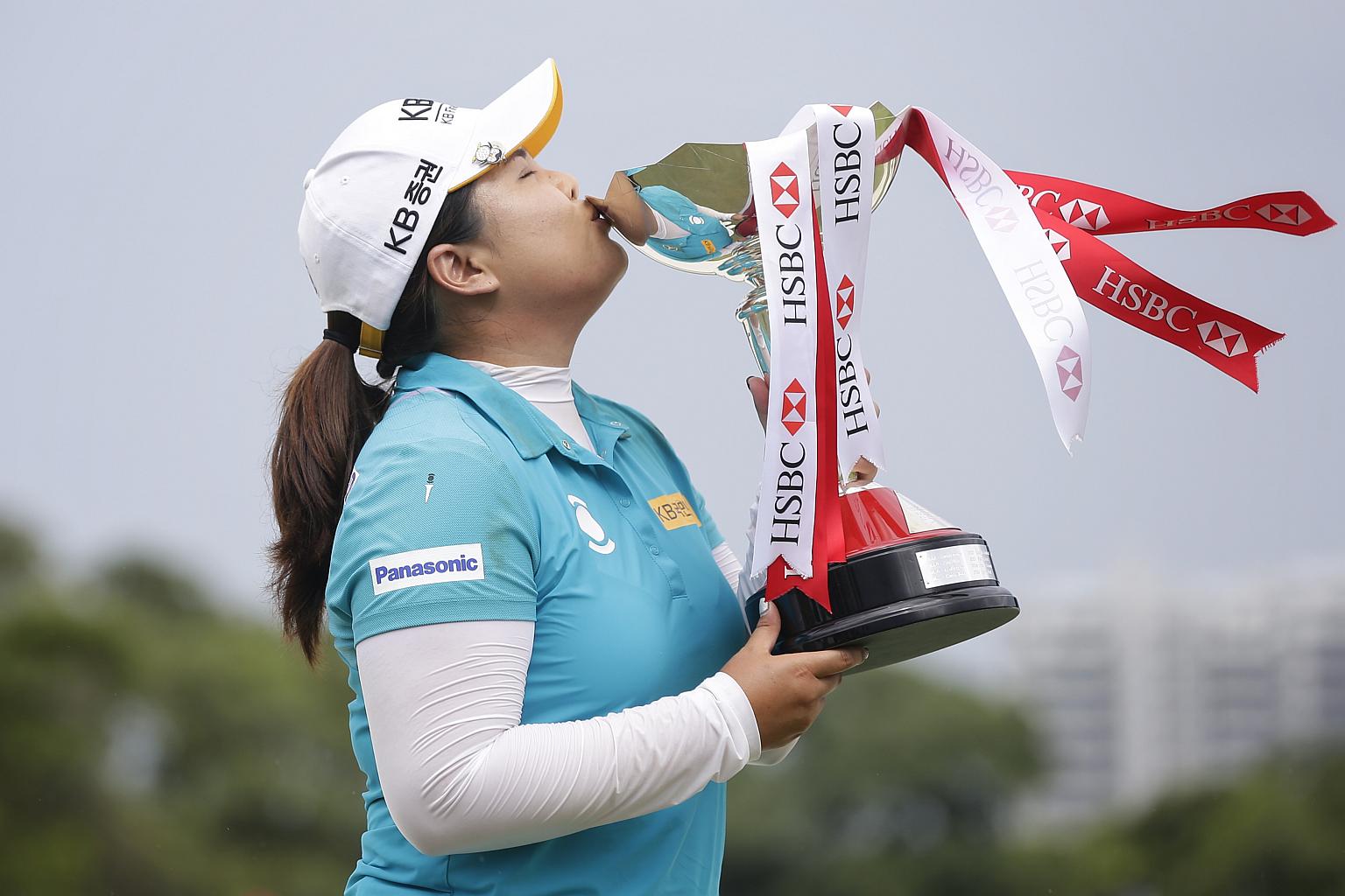 South Korea's Park In Bee kissing the trophy after winning the HSBC Women's Champions at the Tanjong Course in Sentosa on March 5, 2017.