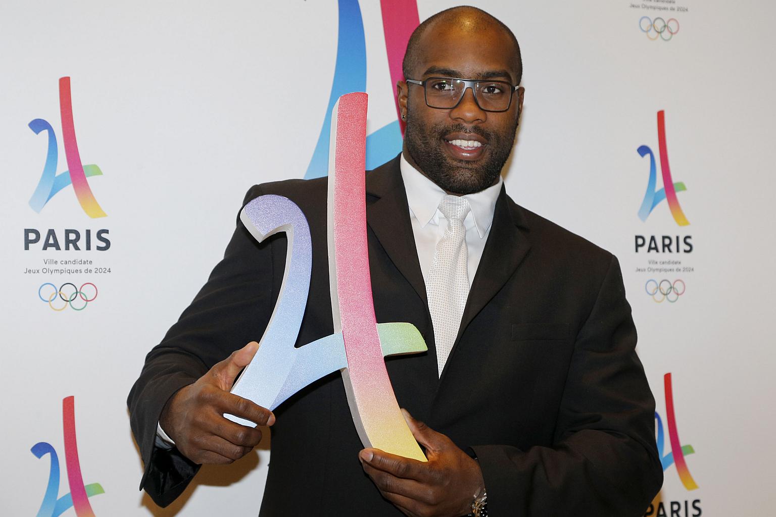 French judoka Teddy Riner poses with the logo of Paris as candidate for the 2024 Olympic summer games during a press conference in Paris.