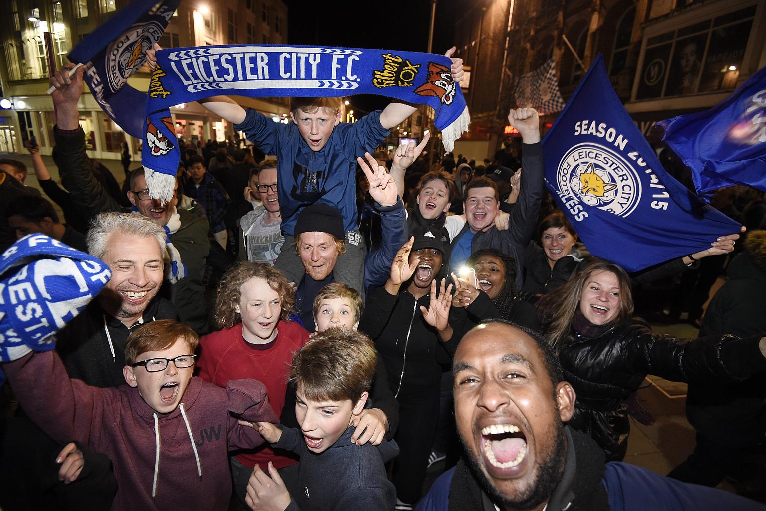 Leicester City supporters celebrate at the Haymarket Memorial Clock Tower after the Premier League match between Chelsea and Tottenham Hotspur, in Leicester, Britain, on May 2, 2016.