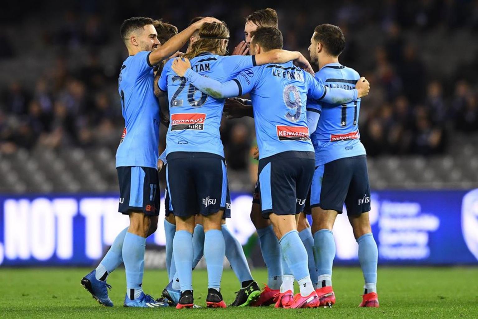 Sydney FC players celebrate against Melbourne Victory at the Marvel Stadium in Melbourne on March 7, 2020.