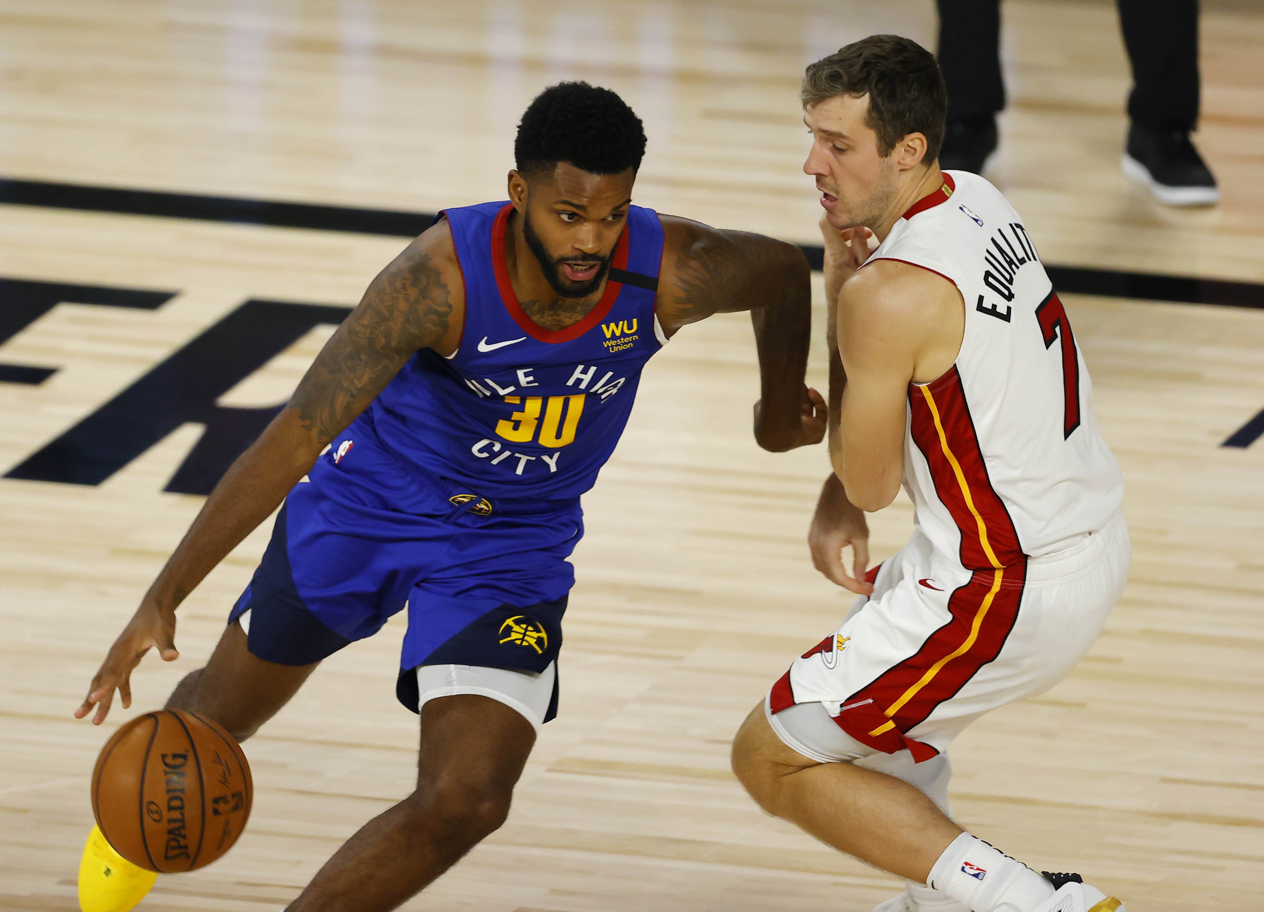 Troy Daniels of the Denver Nuggets drives past Goran Dragic of the Miami Heat on Aug 1, 2020, in Florida.