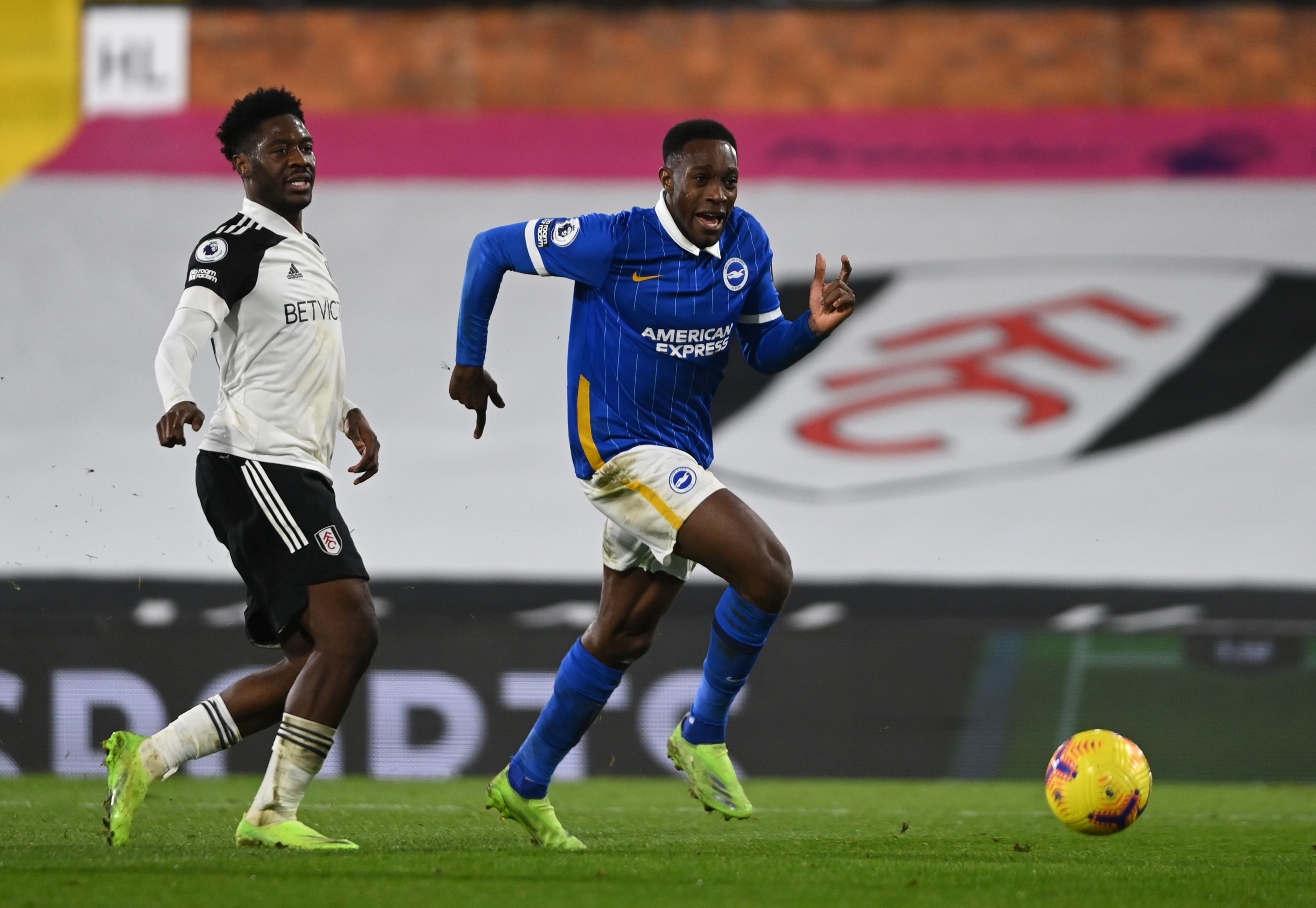 Brighton's Danny Welbeck (right) gets past Fulham's Ola Aina at Craven Cottage in London on Dec 16, 2020.