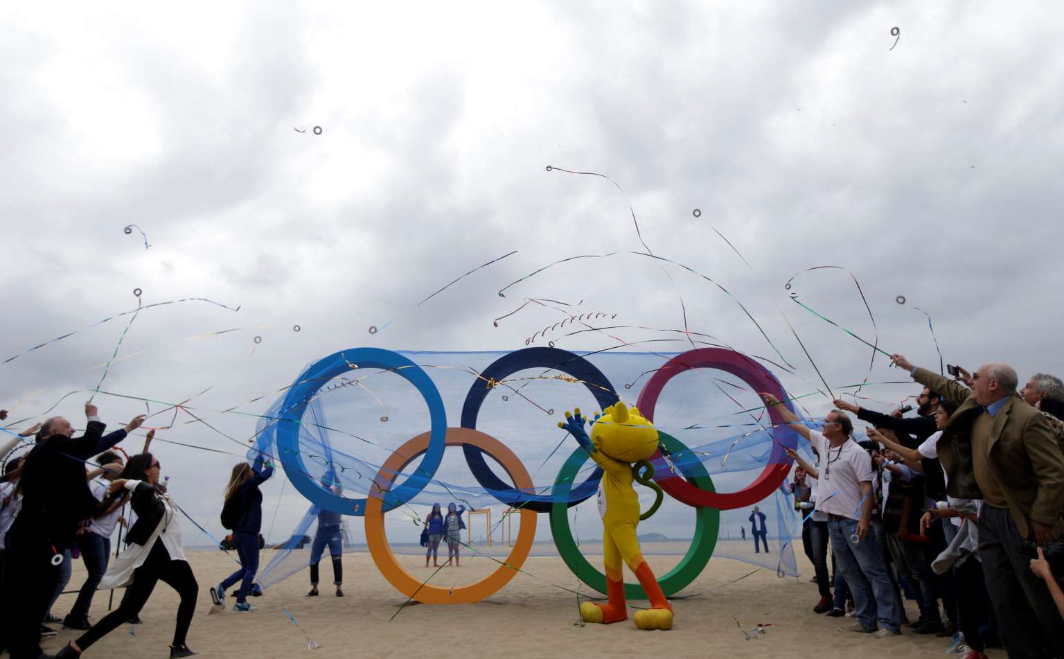 The 2016 Rio Olympics mascot Vinicius (centre) attends the inauguration ceremony of the Olympic Rings placed at Copacabana Beach in Rio de Janeiro, on July 21, 2016.