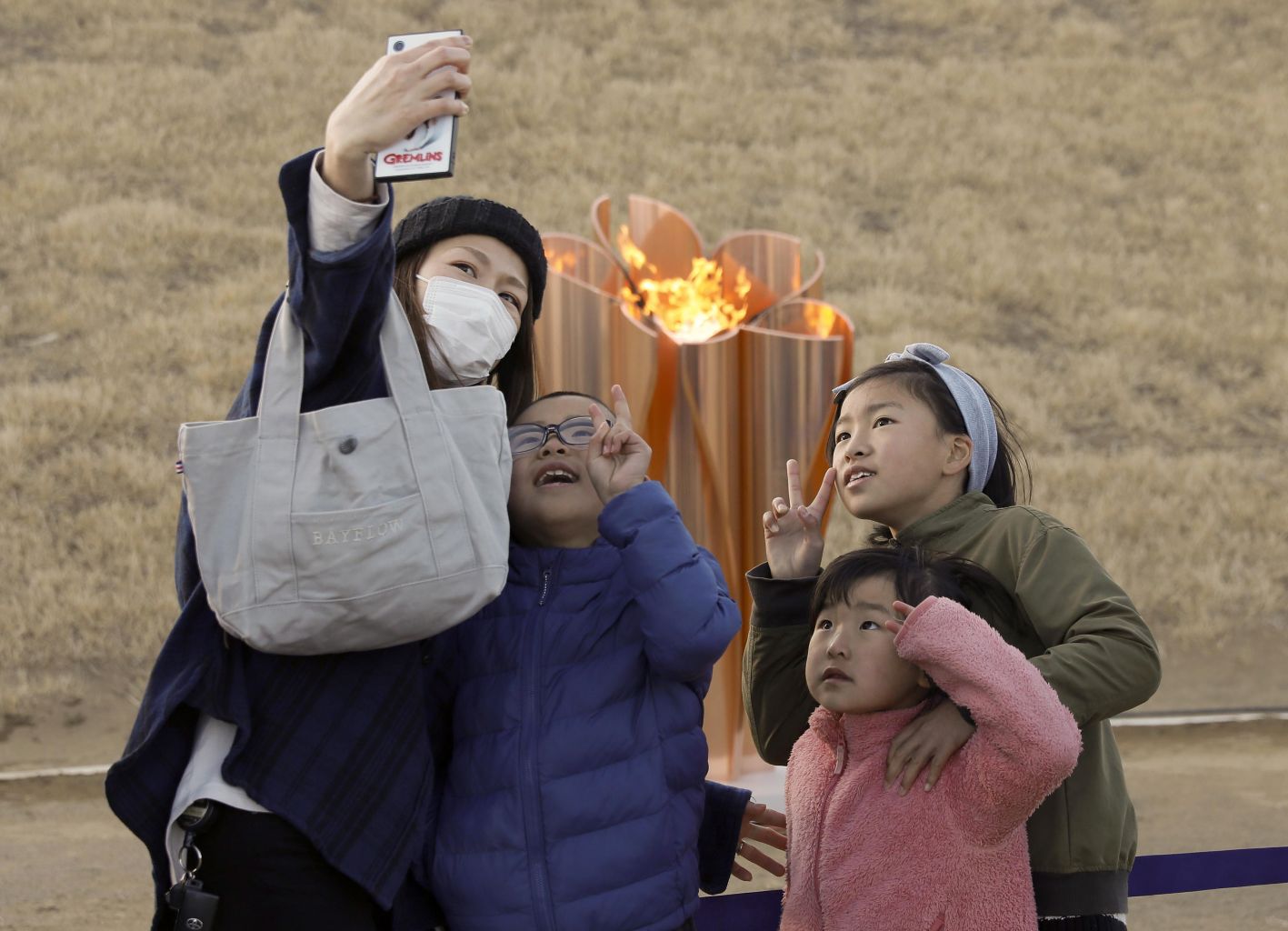 A family takes a selfie with the Olympic flame on a cauldron displayed in northern Japan, March 20, 2020.