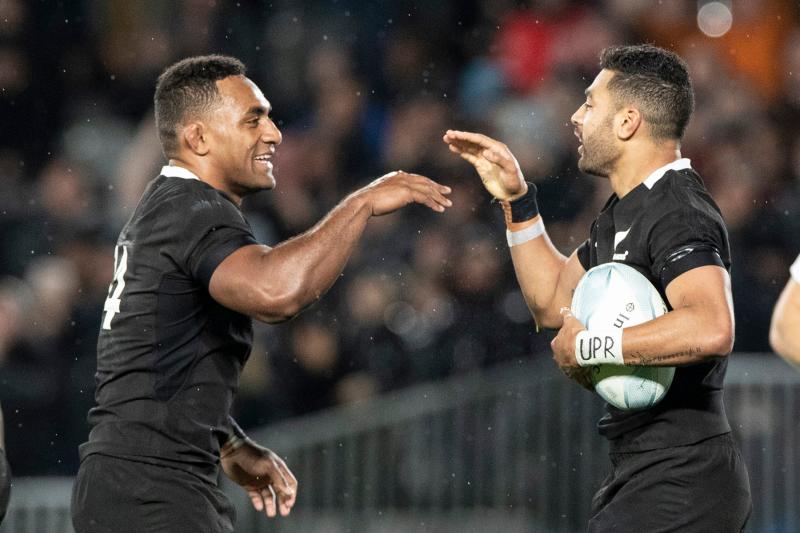 New Zealand's Sevu Reece (left) and Richie Mo’unga celebrate a try during the Rugby Championship Bledisloe Cup Test match between the New Zealand All Blacks and Australia in Auckland on Aug 17, 2019.
