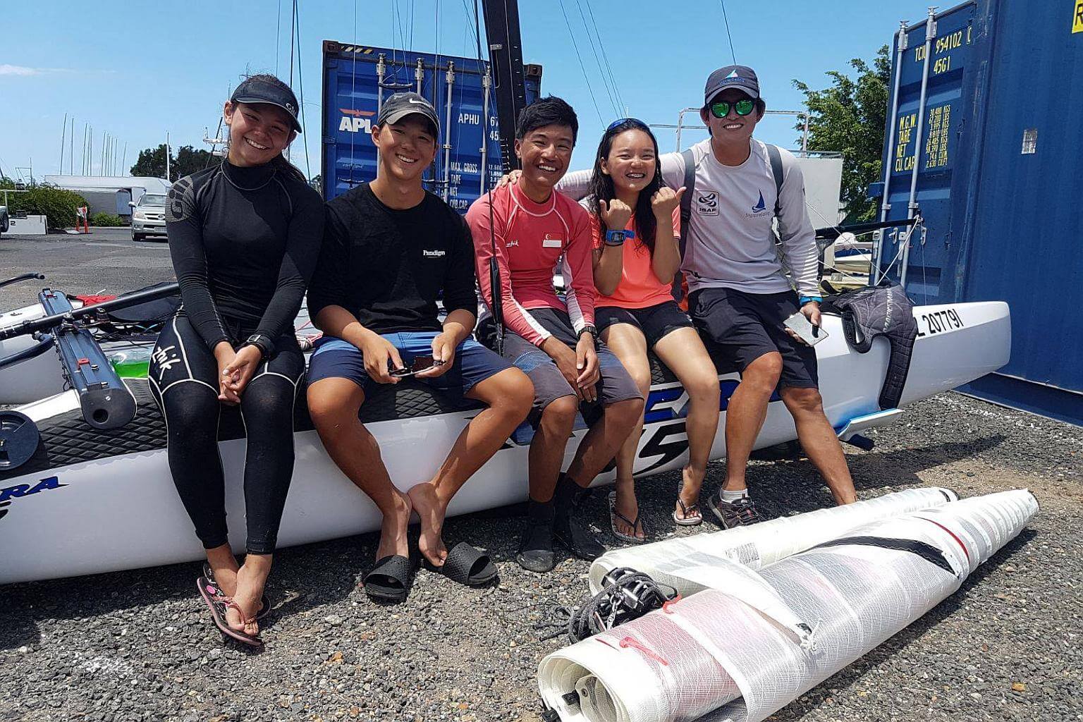 (From left) Singapore's Nacra15 sailors Sophia Rose Meyers, Chia Teck Pin, Raynn Kwok, Vicke Young and coach Terence Koh.