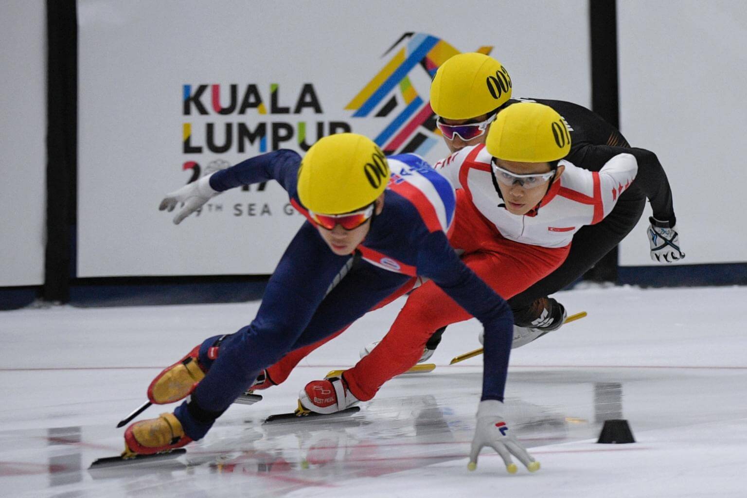 Silver medallist Lucas Ng (centre) in action during the men's SEA Games 1,000m short track speed skating final held on Aug 30, 2017.