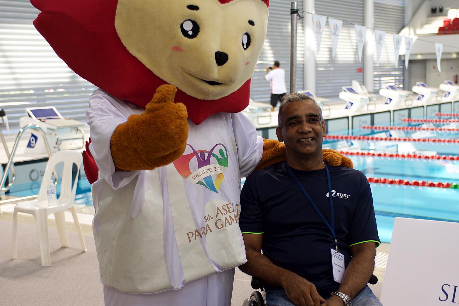 Mr Raja Singh, Singapore's chef-de-mission for the Asean Para Games 2015, with mascot Nila.