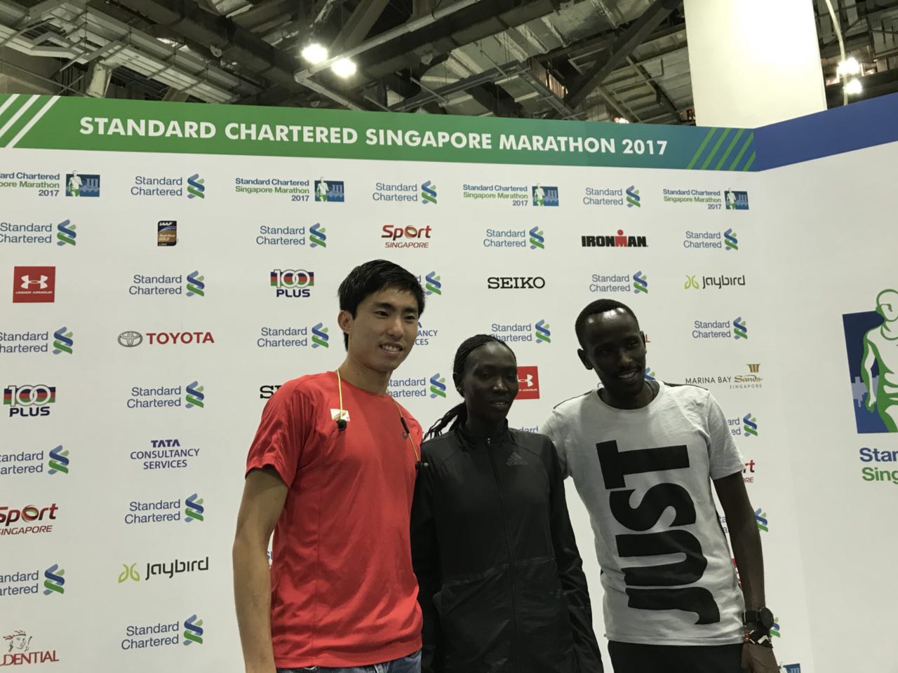 Soh Rui Yong and Kenyans Rebecca Chesir and Cyprian Kotut at the Standard Chartered Singapore Marathon press conference at Marina Bay Sands.