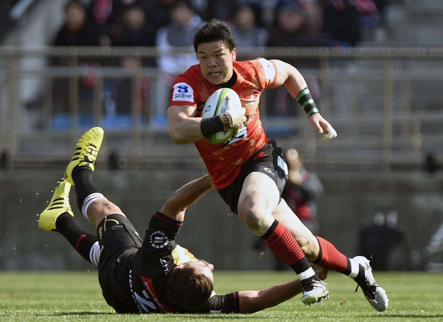 Harumichi Tatekawa (right) of the Sunwolves powers past Robbie Coetzee of the Lions during their Super Rugby opener in Tokyo on Feb 27, 2016.