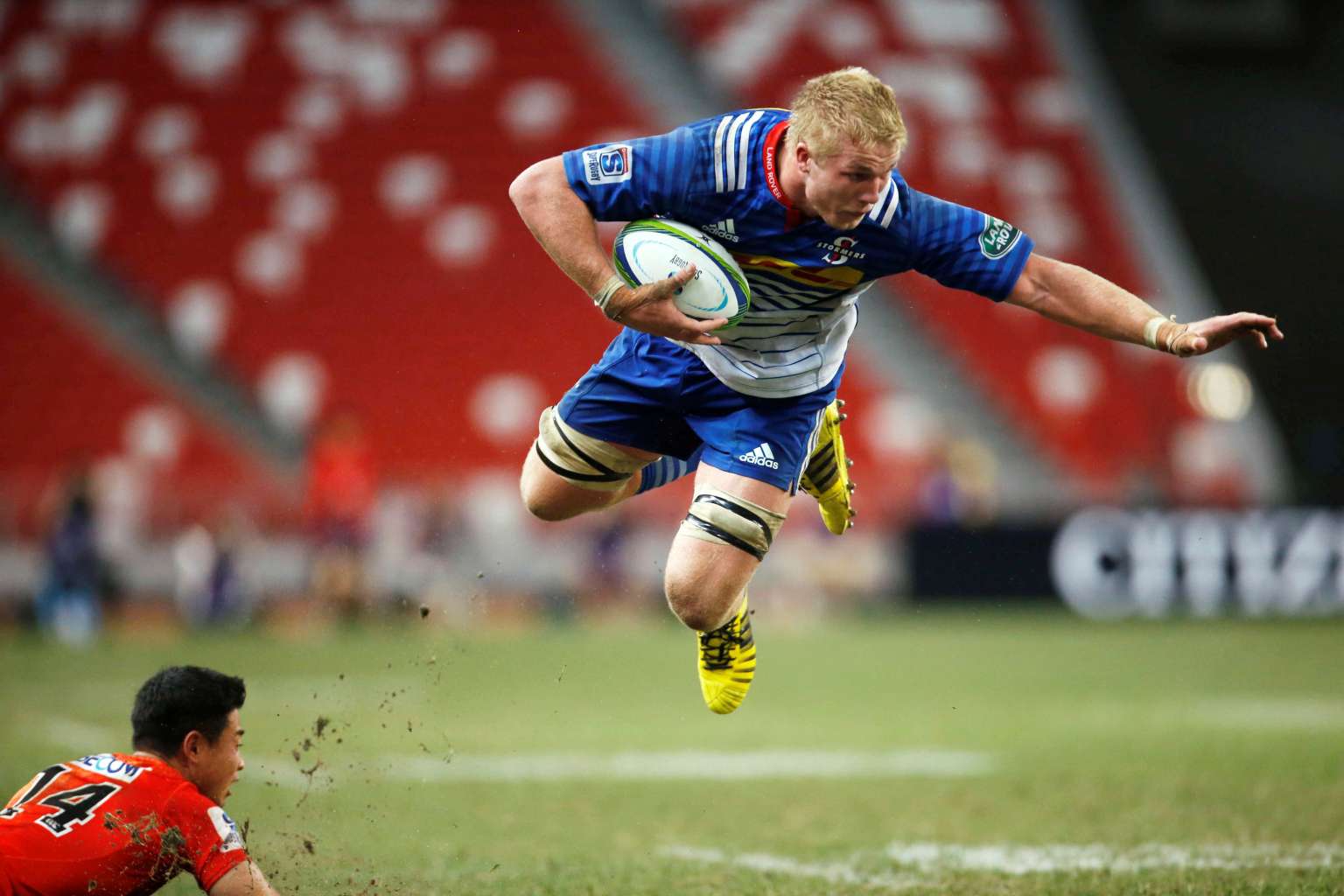 The Stormers' Pieter-Steph Du Toit (right) and Sunwolves' Akihito Yamada in action on May 14, 2016, at the National Stadium.