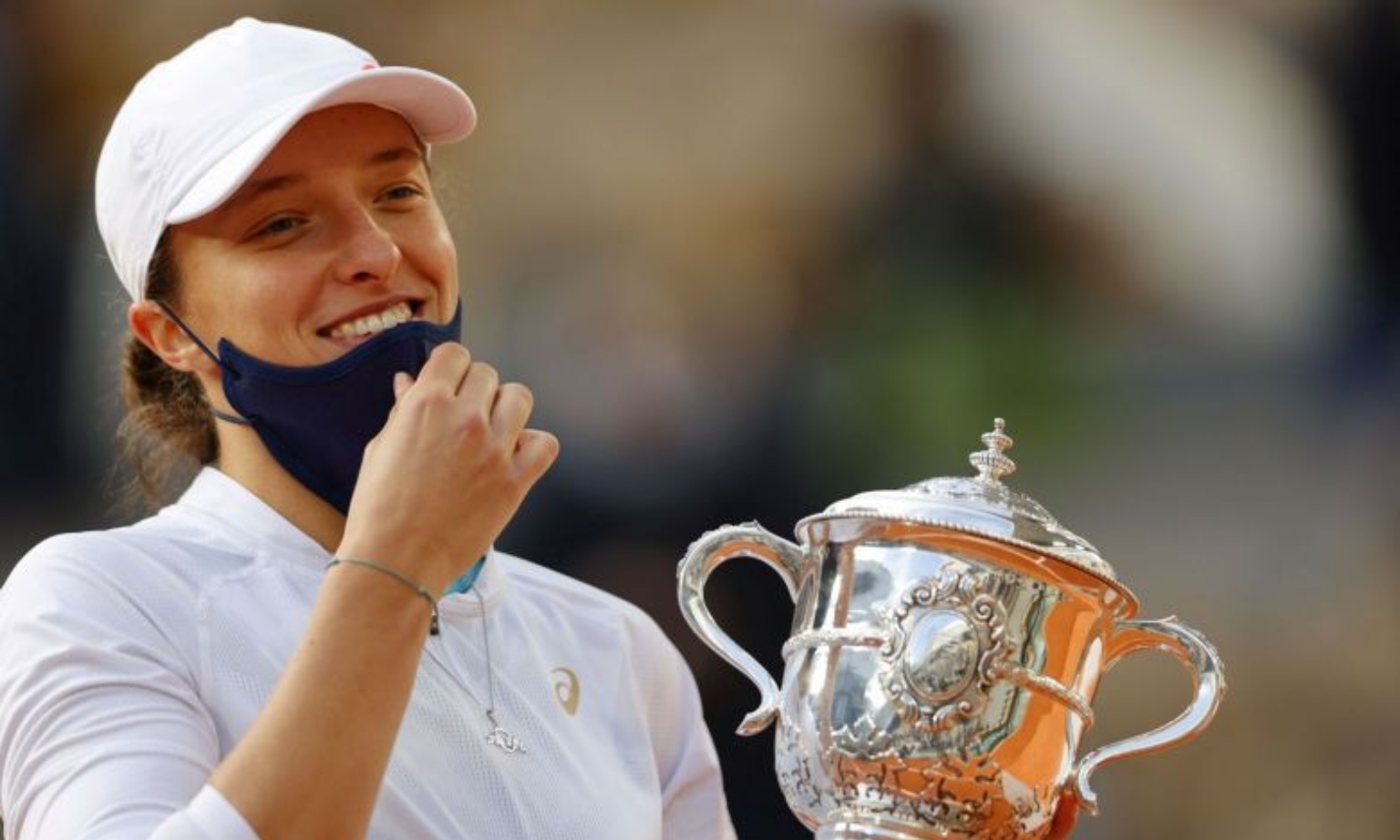 Iga Swiatek celebrates with the Suzanne Lenglen trophy after beating Sofia Kenin of the US.