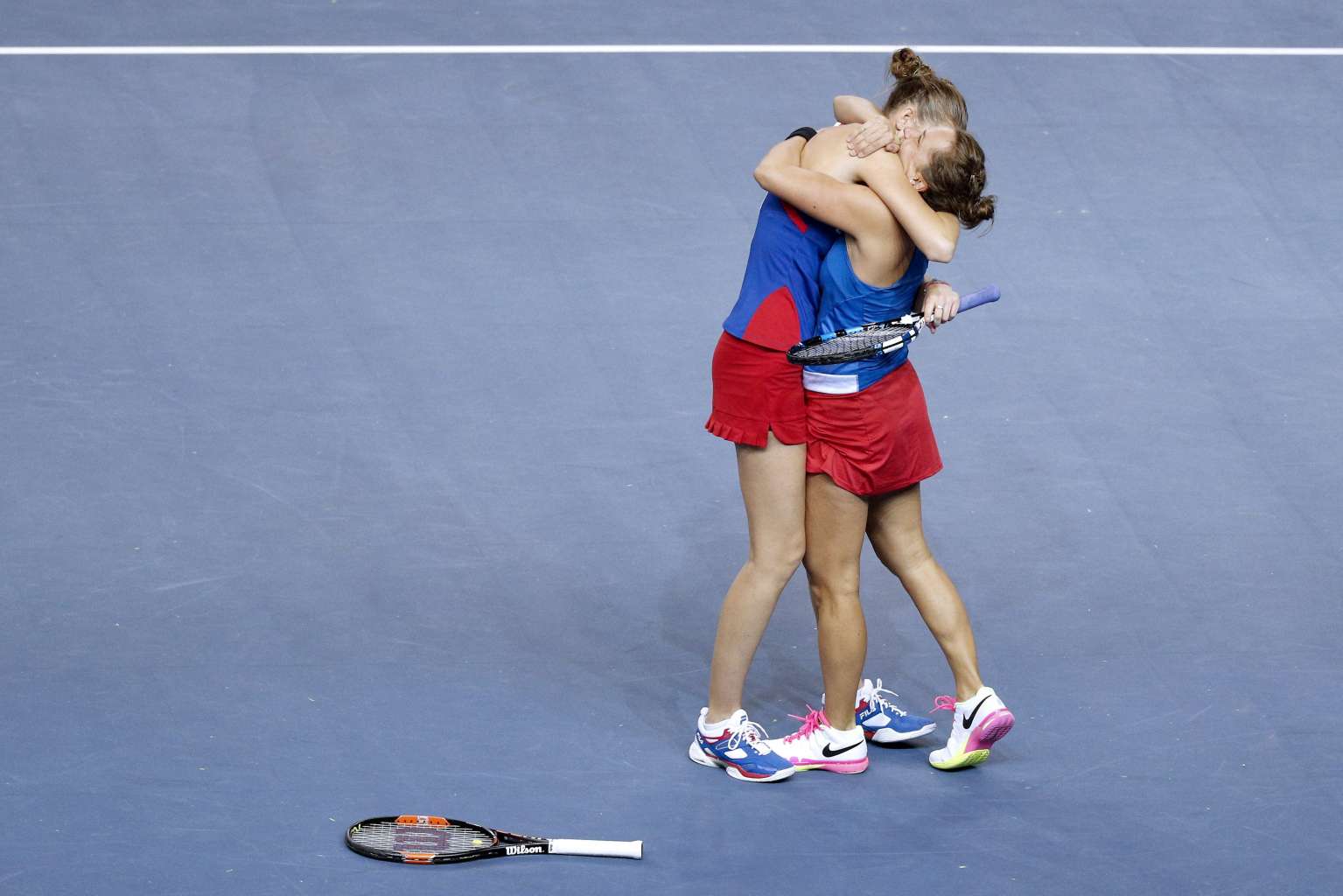 Barbora Strycova (right) and Karolina Pliskova (left) of Czech Republic celebrate winning against Caroline Garcia and Kristina Mladenovic of France during the Fed Cup Tennis World Group final between France and the Czech Republic at the Rhenus Sport stadium in Strasbourg, on Nov 13, 2016.