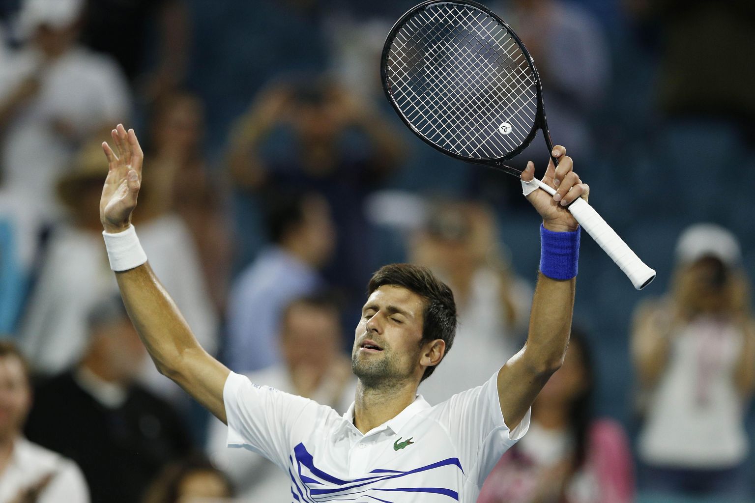 Novak Djokovic celebrates after defeating Federico Delbonis of Argentina on Day 7 of the Miami Open Presented by Itau at Hard Rock Stadium on March 24, 2019.