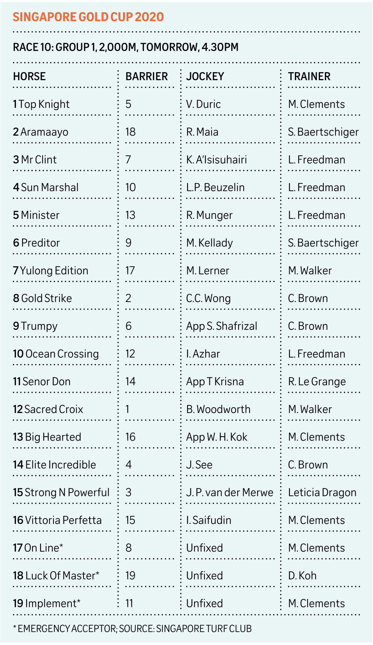 Top Knight coming from way back of the field to win the $400,000 Group 1 Queen Elizabeth II Cup over 1,800m at Kranji on Oct 31. The galloper will be carrying the top weight of 57kg for the Singapore Gold Cup tomorrow at Kranji.