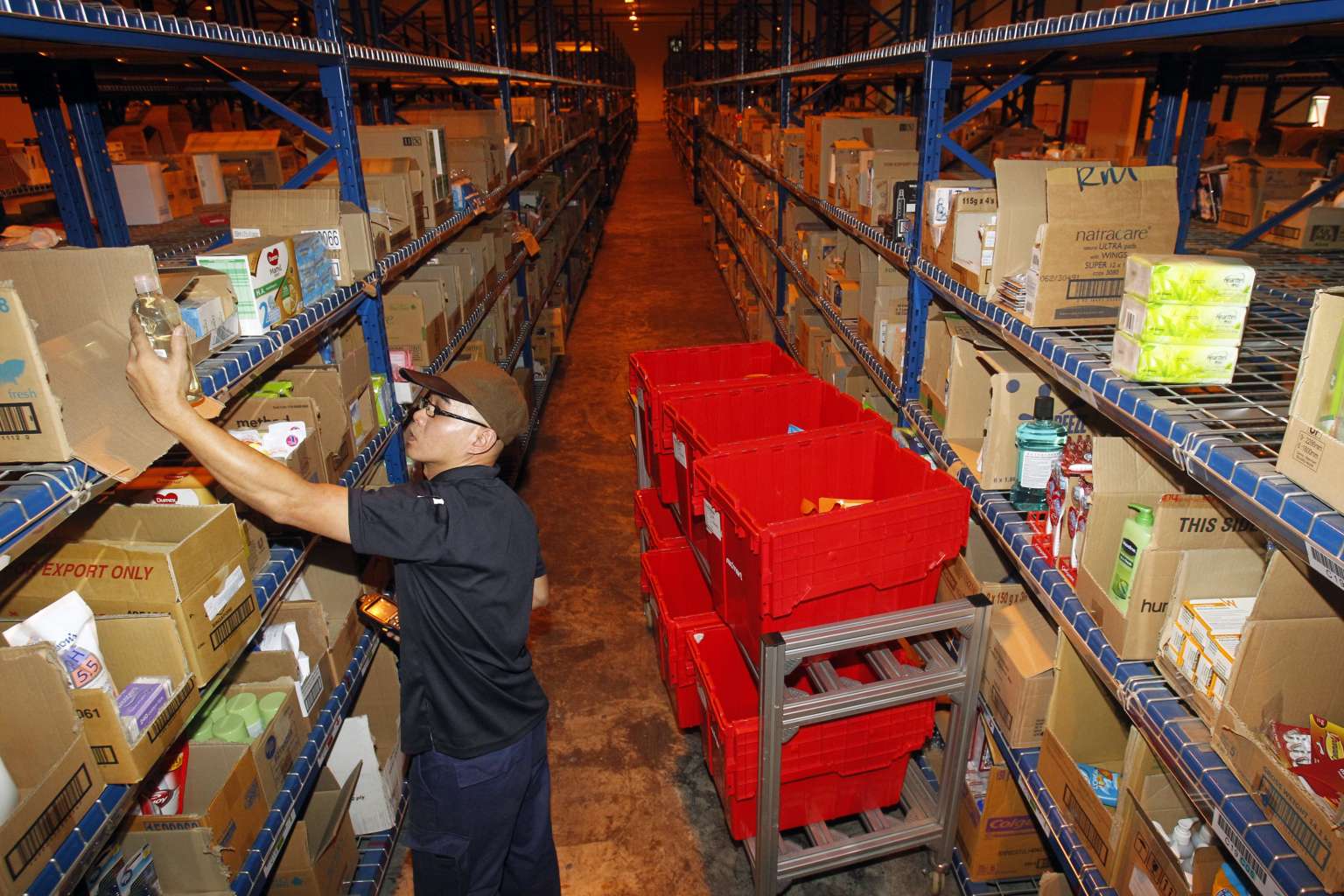 A worker picking grocery items at local online grocery retailer RedMart's warehouse.