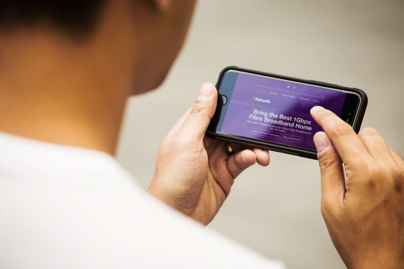 A man browsing the MyRepublic website on a smartphone in Singapore.