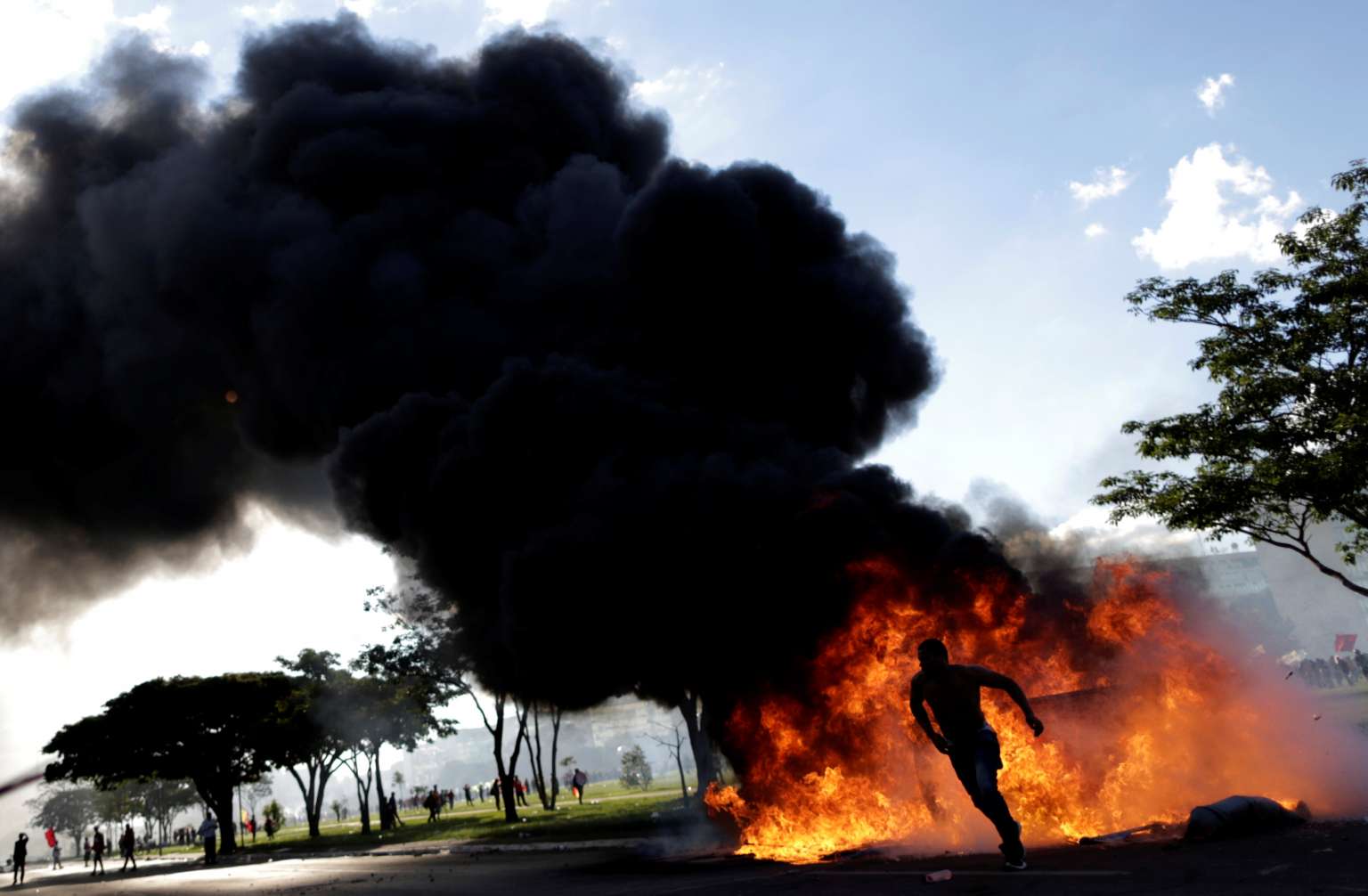 A demonstrator runs near a burning barricade during a protest against President Michel Temer.