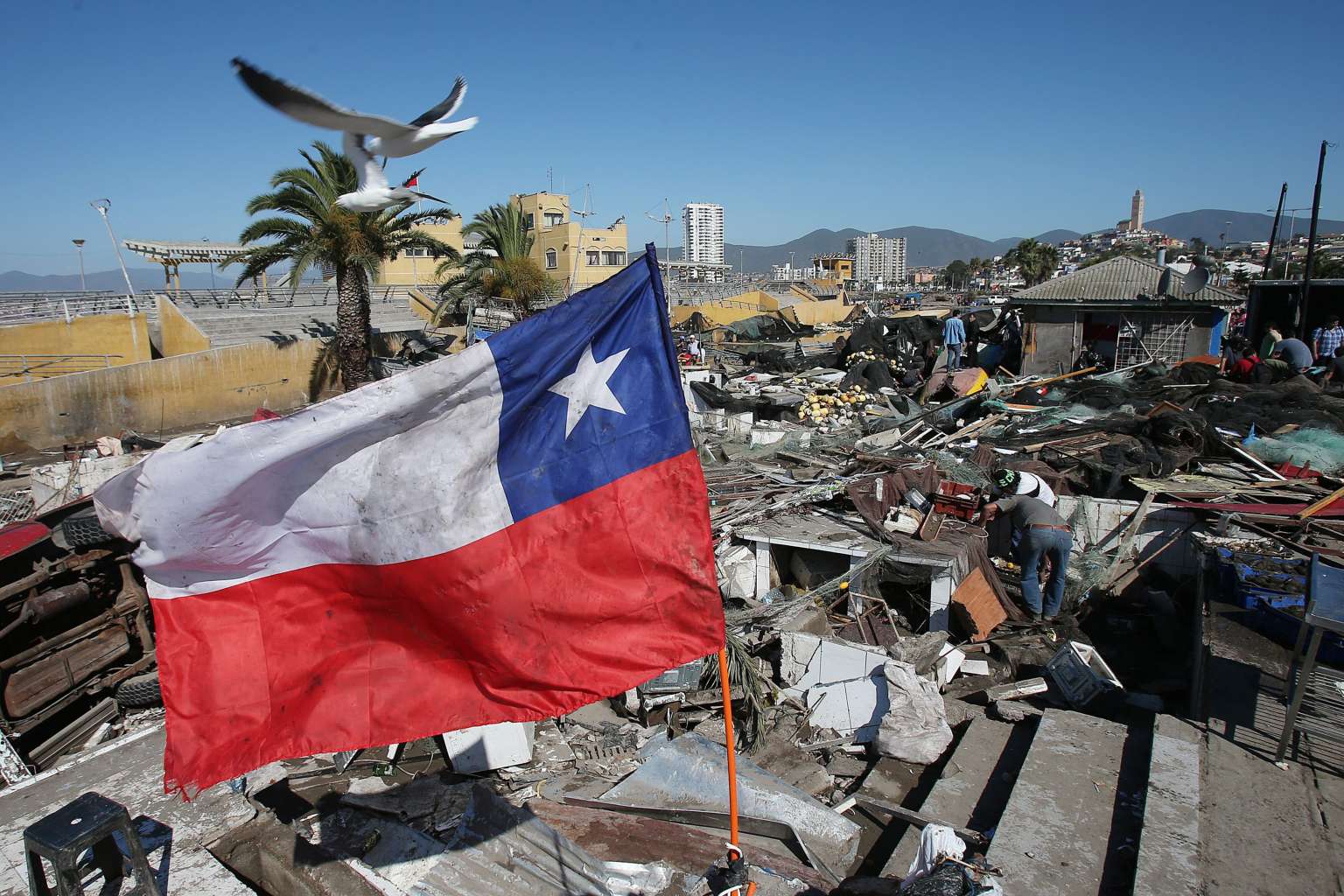 General view of a flea market which was destroyed by a tsunami caused by an earthquake on Sept 16, 2015, in Coquimbo, Chile.
