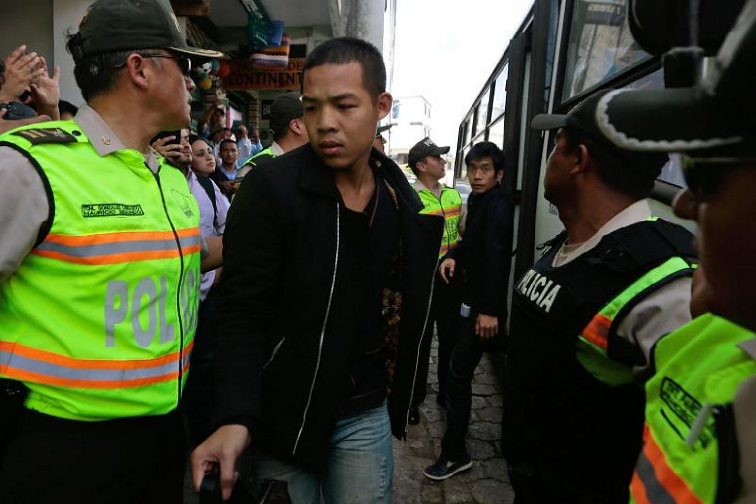 Crew members of the Chinese-flagged ship confiscated by the Ecuadorean Navy arrive in court for a hearing, in San Cristobal, Galapagos Islands on Aug 25, 2017.