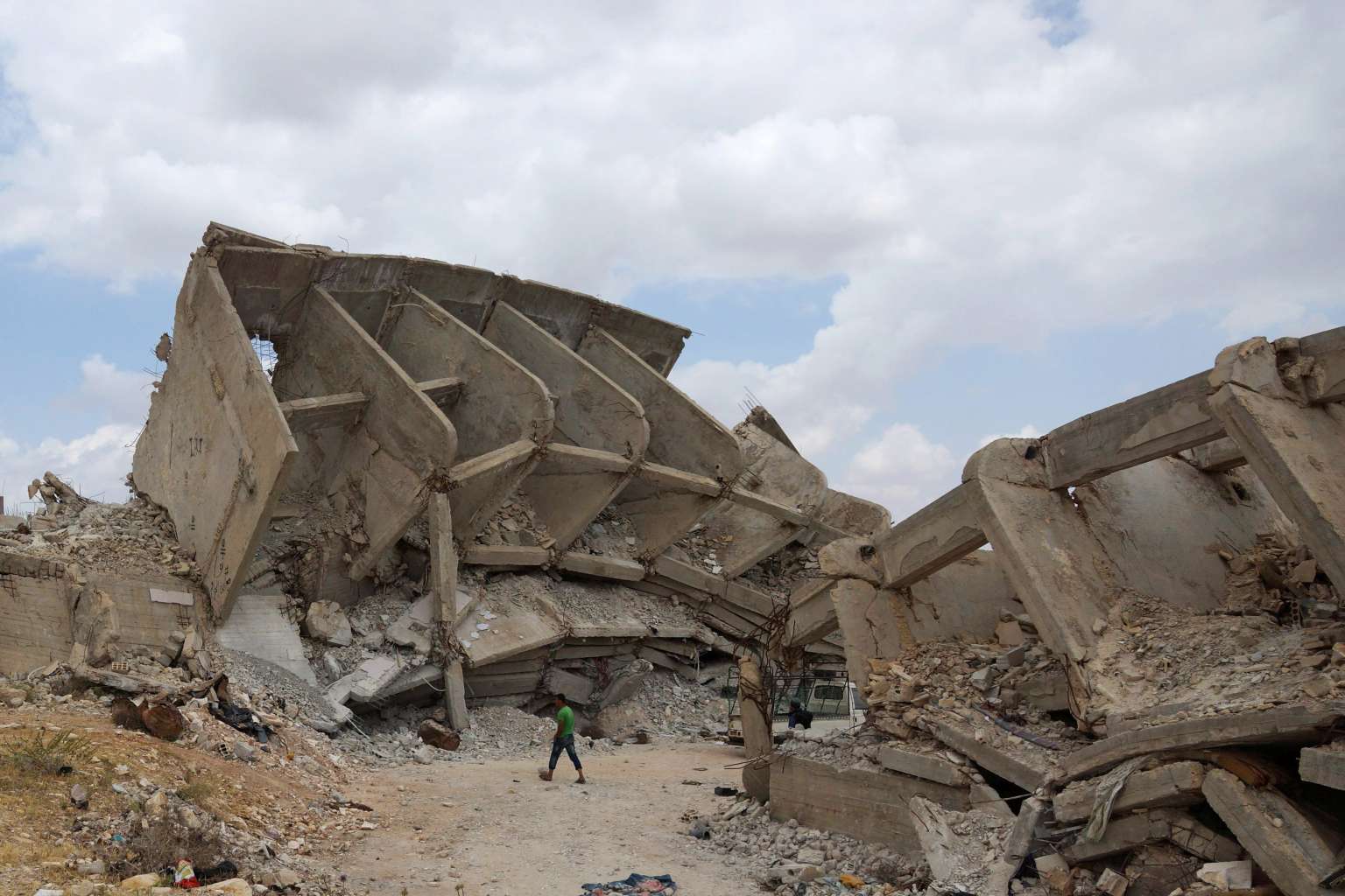 A civilian walks past damaged buildings in the rebel-held area of Deraa, Syria on May 24, 2016.
