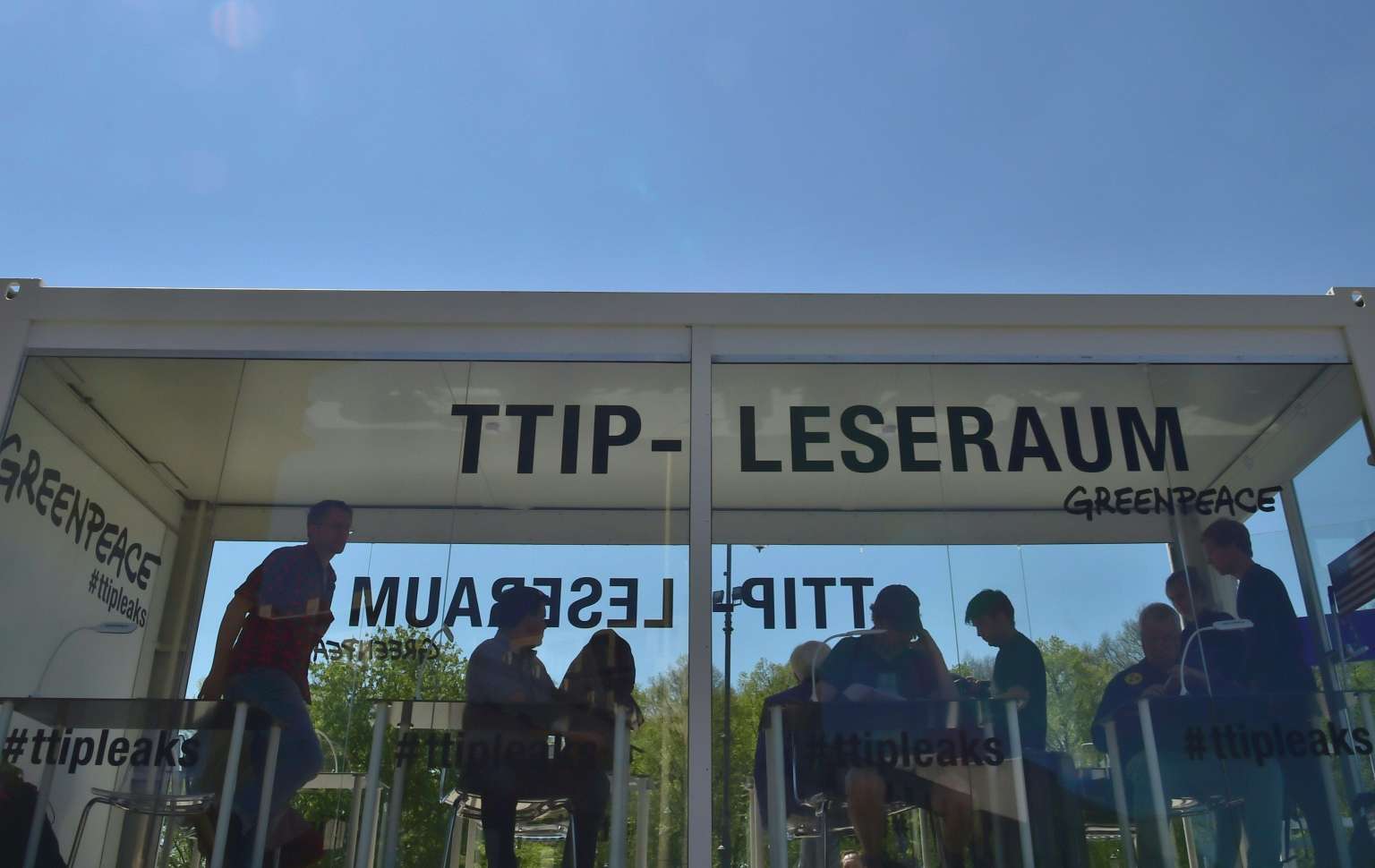 People read classified papers from the ongoing US-EU trade talks, presented to the public by Greenpeace in a glass container near the Brandenburger Gate, in Berlin on May 2, 2016.