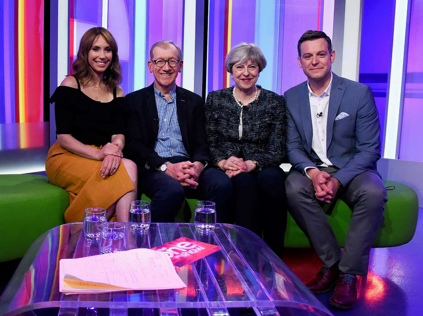 British Prime Minister Theresa May (2nd from right) and her husband Philip Jon May (2nd from left) as they pose for a photograph with the hosts of the BBC's The One Show, Matt Baker (right) and Alex Jones.