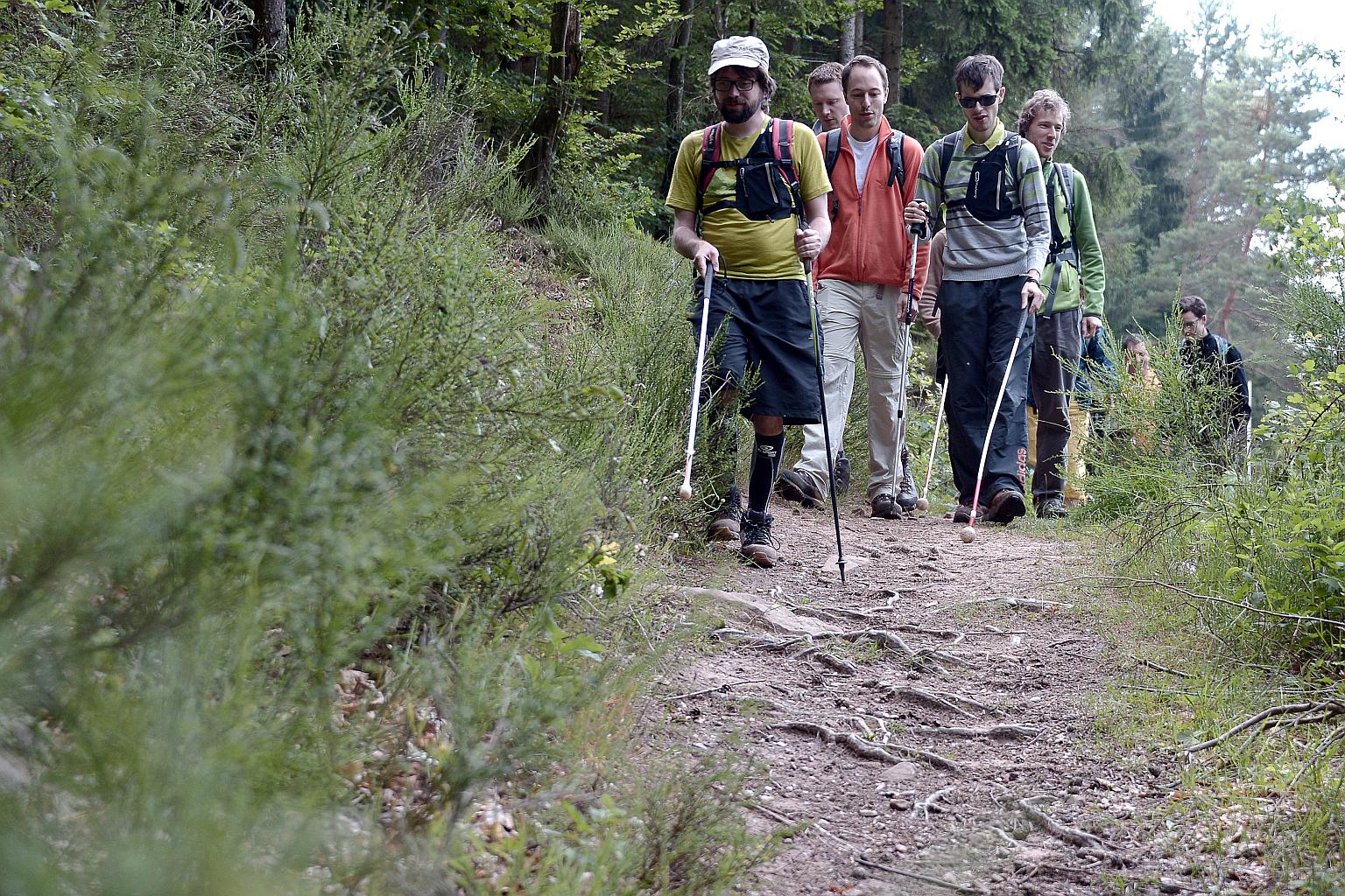 People with visual impairment take part in a hike with a white cane and a GPS device using voice navigation in Reipertswiller, eastern France, on June 25, 2015.