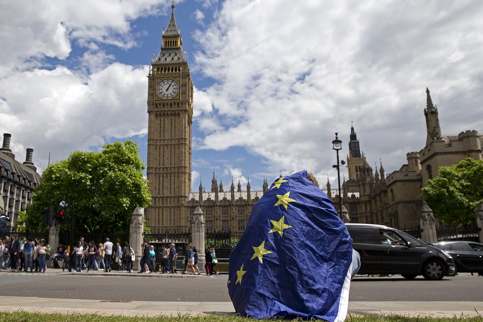 A demonstrator draped in an EU flag sits on floor during a protest against the outcome of the UK's June 23 referendum on the European Union, in central London on June 25.
