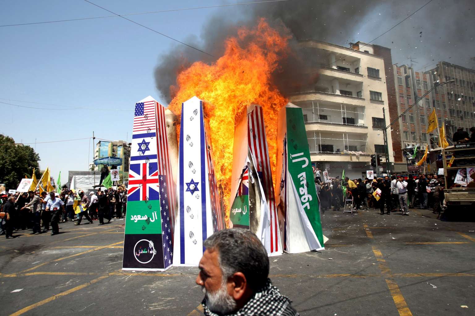 Iranian demonstrators burn symbolic structures depicting the flags of the US, Britain, and Israel during a rally marking al-Quds (Jerusalem) Day in Teheran July 10, 2015.