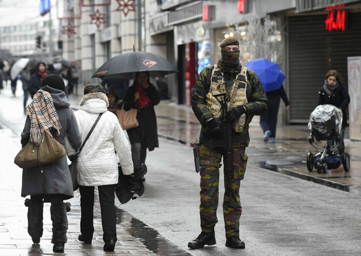 A soldier patrols outside a shopping center in Brussels on Nov 21, 2015.