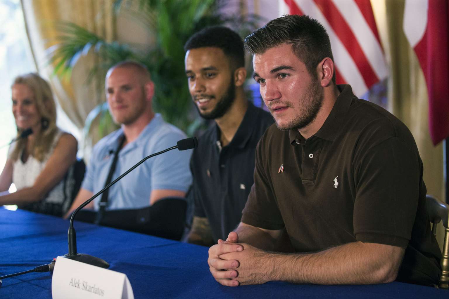 US Ambassador to France Jane Hartley (left to right), US serviceman Spencer Stone, US student Anthony Sadler and US serviceman Alek Skarlatos attend a press conference at the US embassy in Paris, France on Sunday.