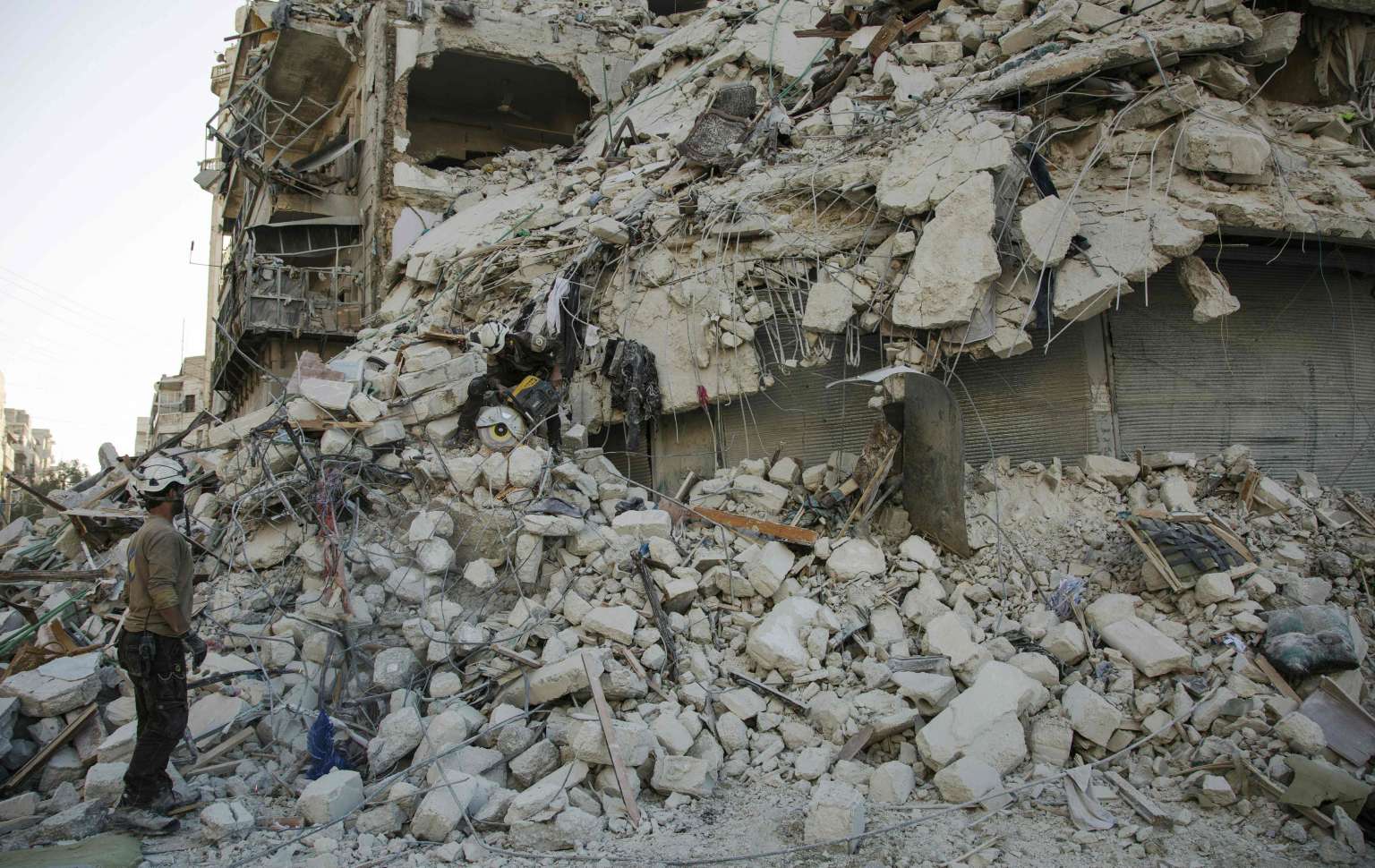 A member of the Syrian Civil Defence stands amid the rubble of a destroyed building during a rescue operation following reported air strikes in the rebel-held Qatarji neighbourhood of Aleppo, on Oct 17, 2016.