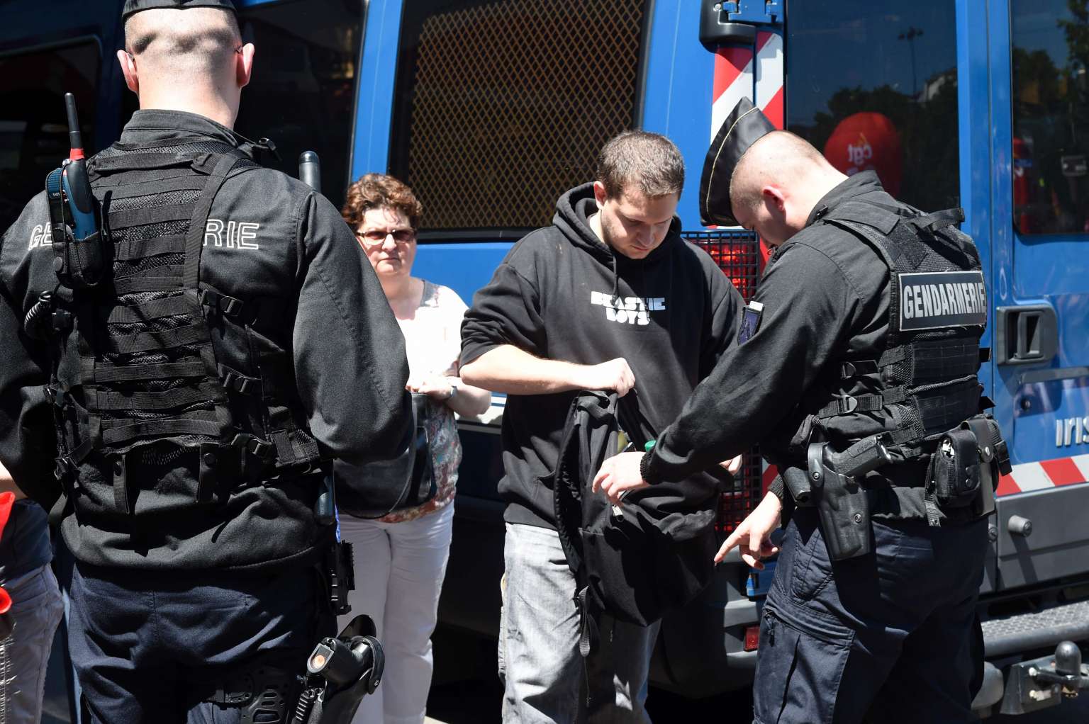 French police forces control a man prior to a demonstration against the series of controversial labour reforms on June 23, 2016 in Paris.