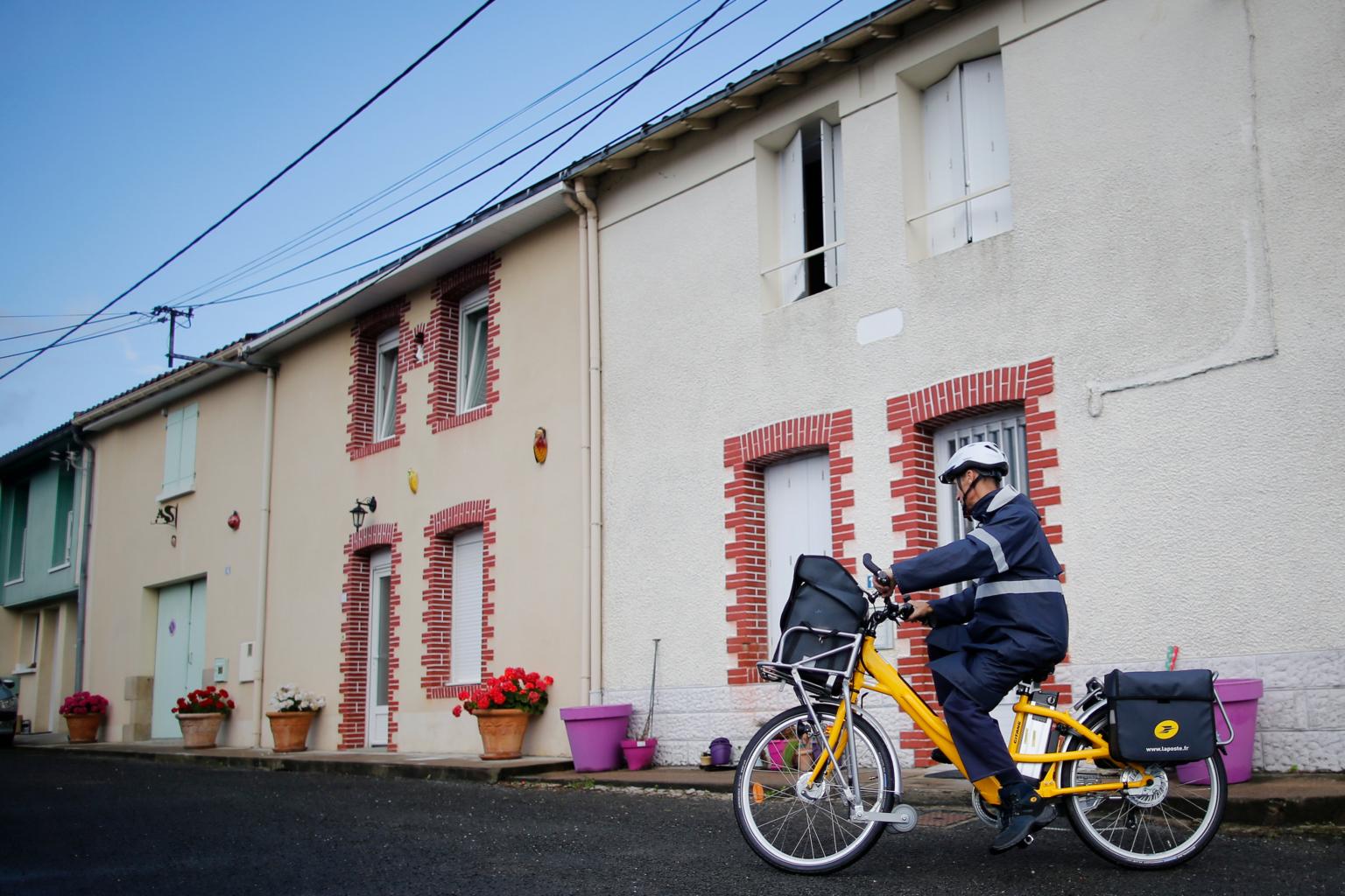 A postman of French postal service company La Poste distributes letters using an electrically-assisted bicycle in Vertou, France.