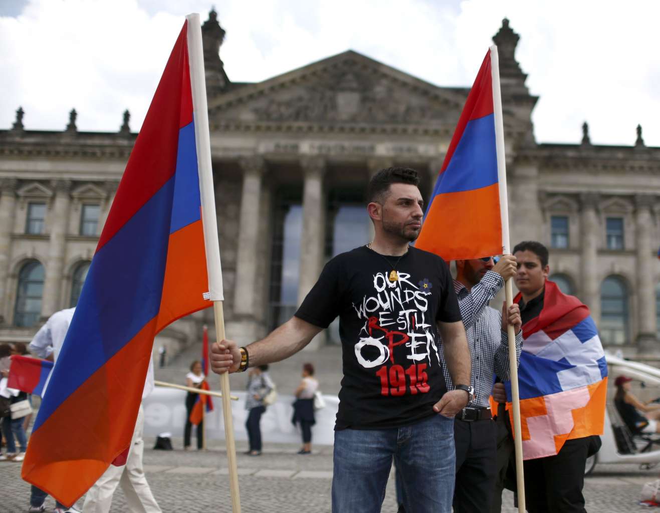 Supporters hold Armenian flags in front of the Reichstag, the seat of the lower house of parliament Bundestag in Berlin, Germany, on June 2, 2016.