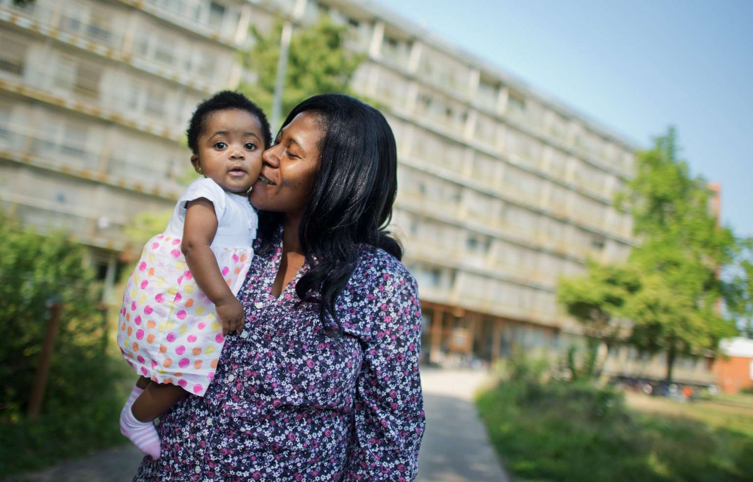 Six-month-old Angela Merkel Ade with her mother Ophelya Ade outside the Oststadtkrankenhaus refugee accommodation in Hanover, Germany on Aug 13, 2015.