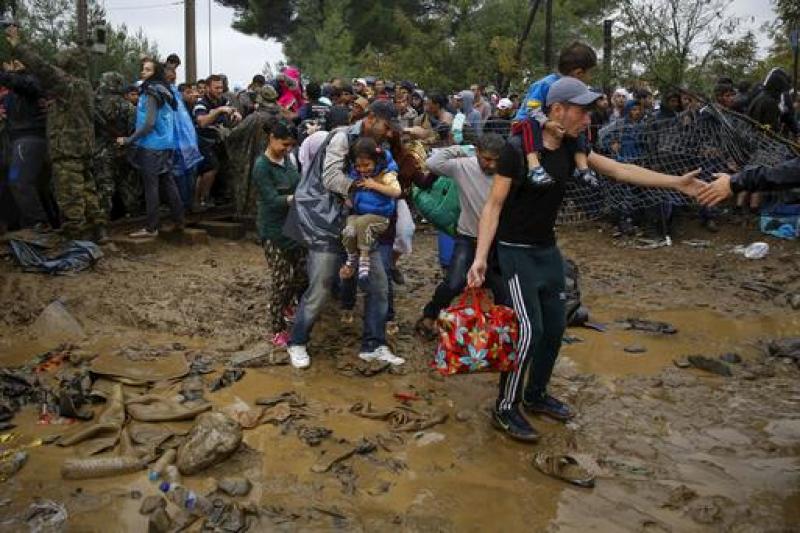 Syrian refugees walk through the mud as they cross the border from Greece into Macedonia, near the Greek village of Idomeni, on Sept 10, 2015.