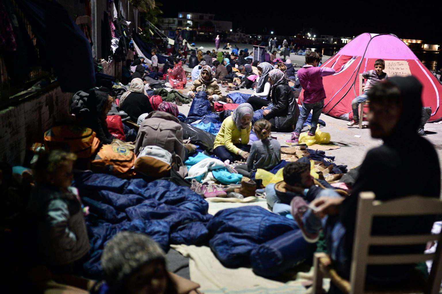 Refugees prepare to sleep at the port in the town of Chios, where refugees and migrants broke out from Vial detention center camp, on April 3, 2016.