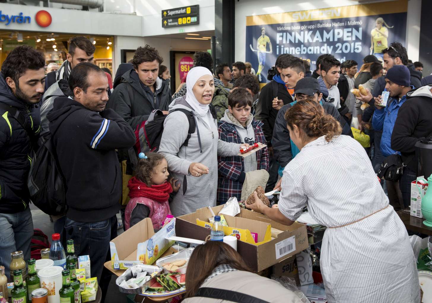 Volunteers distribute food and drink to migrants arriving at Malmo train station in Sweden in September 2015.