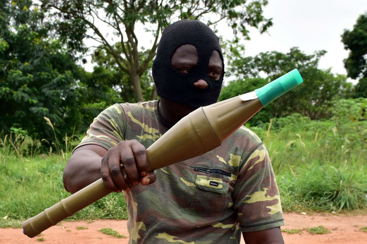 A mutinous Ivory Coast soldier holds an RPG rocket launcher, May 15, 2017.
