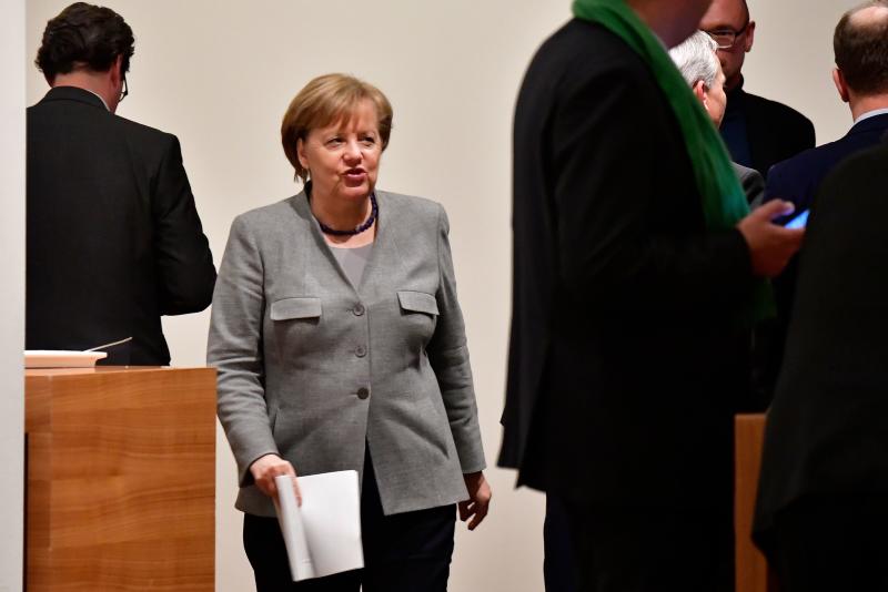 German Chancellor Angela Merkel makes her way from an exploratory talks meeting with members of potential coalition parties to form a new government on Nov 19, 2017 in Berlin.
