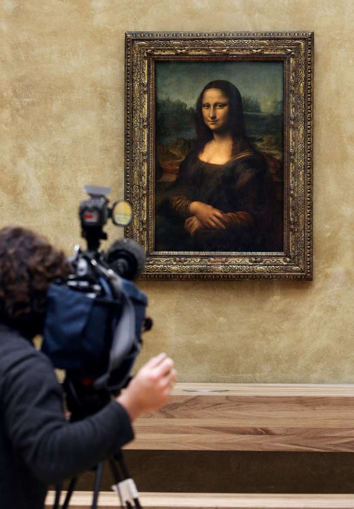 A cameraman filming Leonardo da Vinci's Mona Lisa at the Louvre in Paris, France.