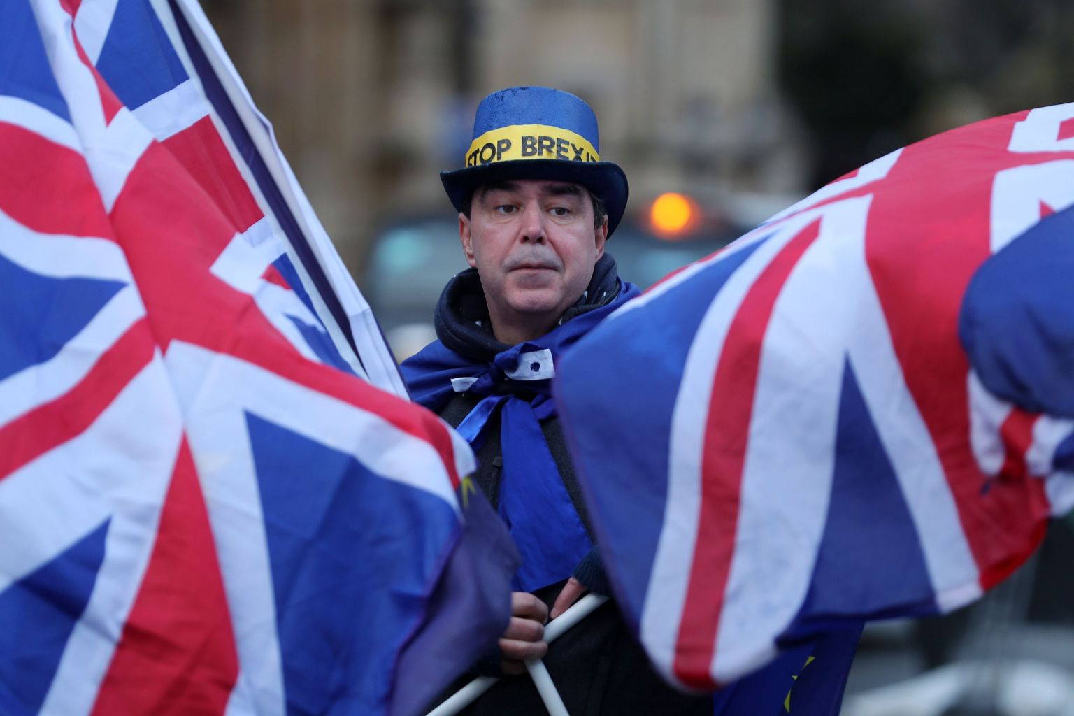 A pro-EU anti-Brexit demonstrator waves EU and British flags outside the Houses of Parliament in London.