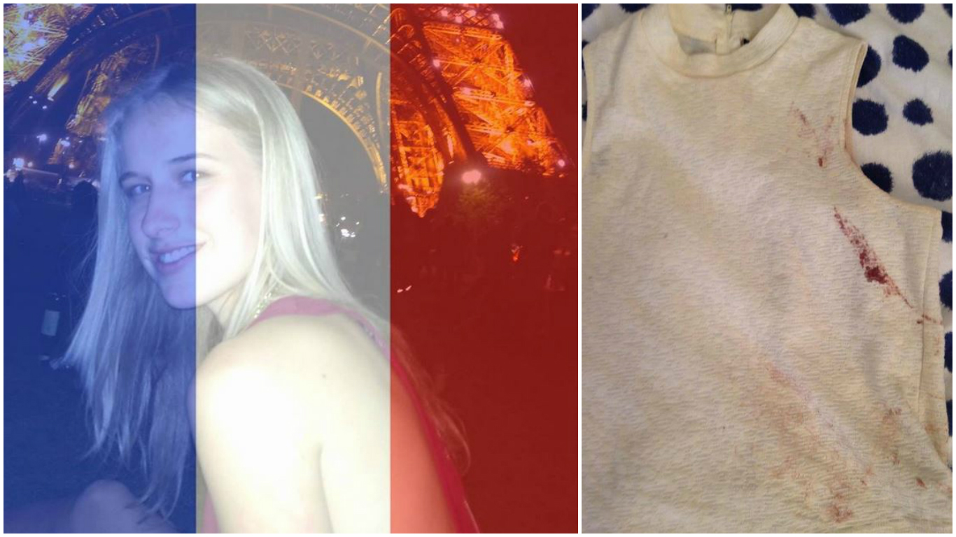 Bataclan theatre survivor Isobel Bowdery and a picture of the blood-stained shirt she wore on the night of the attack in Paris.